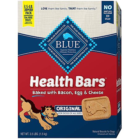• The 3.5-lbs Blue Buffalo Health Bars Natural Crunchy Dog Treats Biscuits (Bacon, Egg, & Cheese) are $1.47 less (25% savings) than the list price.