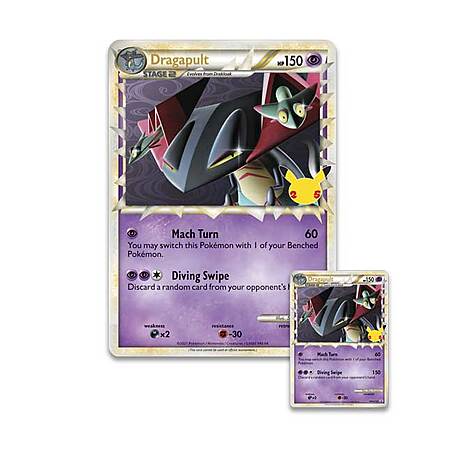 Diving at supersonic speeds, Dragapult swoops into your collection as an impressive Pokémon Prime! This powerful collection includes Pokémon TCG: Celebrations boosters as well as Dragapult Prime and its ghostly stealth—can you strike at just the right moment? If so, dig just a touch deeper and you'll find additional surprises including a binder and more!