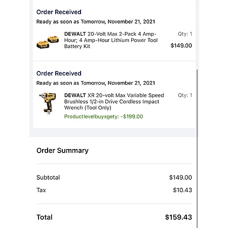 YMMV - Free Dewalt 20V Brushless Impact Wrench DCF894B with purchase of Dewalt 4AH battery 2-pack at Lowes $149