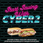 Jersey Mike's Subs (Store Locator) is offering $2 Off Any Regular Jersey Mike's Sub w/ promo code CYBER2 (apply in app checkout) valid for Mobile App Purchase only [iOS or Android].