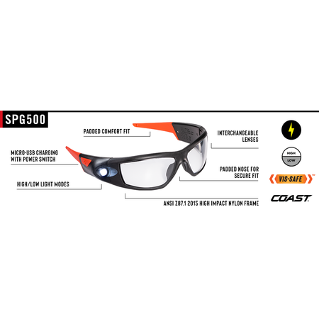 Model: Coast SPG500 Rechargeable Lighted LED Safety Glasses, Bulls-Eye Spot Beam, ANSI Z87 Standards, 2 Scratch Resistant Lenses (Clear, Yellow) Included, UV Protection, Protective Carrying Case Included