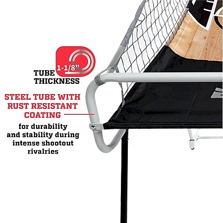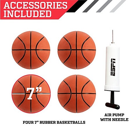 - LED electronic scoring with realistic arcade sound effects, four basketballs and air pump
