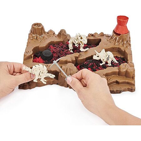 - This fun Kinetic Sand kids toy opens up to reveal a themed play area and includes a 2-in-1 pickaxe and shovel to help you find 10 dinosaur bones hidden under Kinetic Sand!