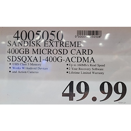 Costco Wholesale has for their Members: 400GB SanDisk Extreme U3 A2 V30 microSD Memory Card w/ Adapter for $49.99 Now $42.99. Shipping is free.