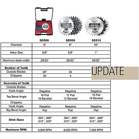 What's more impressive though, was swapping my standard 10" blade to a 7-1/4... A 40t blade cost me 15$ and ripped thru oak and walnut stock with ease. You can get a 24t Irwin maple 7-1/4 for 6$... Super thin kerf: minimal waste, lower dust, and quieter too... I would think the same principals apply to the dado set (unless you really need that extra rotational mass and depth of cut)