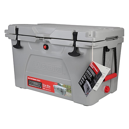 The Everbilt 52 qt. The cooler is designed for river trips, camping, and other outdoor activities. The High-Density Polyurethane Foam insulation keeps ice for 4-days to 7-days, with a no-sweat design eliminating condensation on the outside of the cooler. It features Rubber Pad non-slip feet to keep the cooler secure in your vehicle or boat. An interlock no-fall lid stays up when you're unloading the cooler, and carry handles fold away for easy packing in a truck or raft. A drain release is located at the base of the cooler so you can keep melted water out of the cooler and your food.