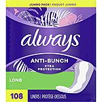 Always Anti-Bunch Xtra Protection Daily Liners Long Unscented, Anti Bunch Helps You Feel Comfortable, 108 Count 2 of these total 216 for this price, anti bunch, long extra protection liners,