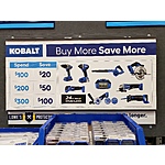 Kobalt® power tools/accessories. Discount amount varies based on final total purchase price of eligible Kobalt® item(s) before taxes. $20 discount when you spend $100 - $199.99; $50 discount when you spend $200 - $299.99; $100 discount when you spend $300 or more.