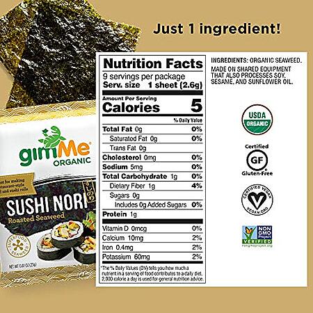 Amazon has 9-Sheets gimMe Organic Roasted Seaweed Sushi Nori for $2.09 when you checkout w/ Subscribe and save. Shipping is free w/ Prime or on orders of $25+.