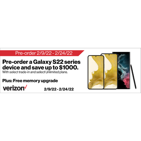 Preorder a Galaxy S22 series and save up to $1000 with trade in and select Unlimited Plans & Free Memory Upgrade