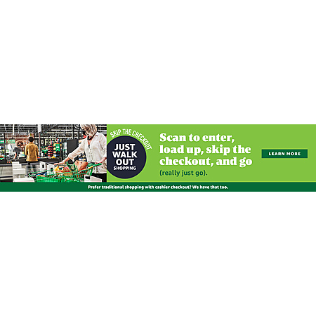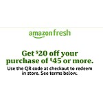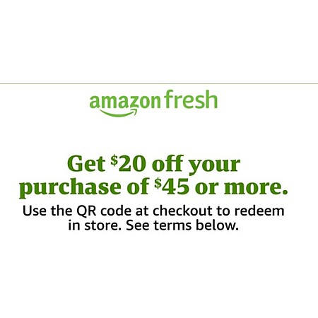 Offer expires at 11:59 p.m. (PT) February 21, 2022. Offer available only on in-store purchases at Amazon Fresh stores. Minimum purchase is based on subtotal of all qualifying items at checkout, excluding alcohol, gift cards, regulatory fees, taxes, and any items prohibited by law. Amazon may modify or cancel this offer at any time. Restrictions apply, see amazon.com/freshcoupon (