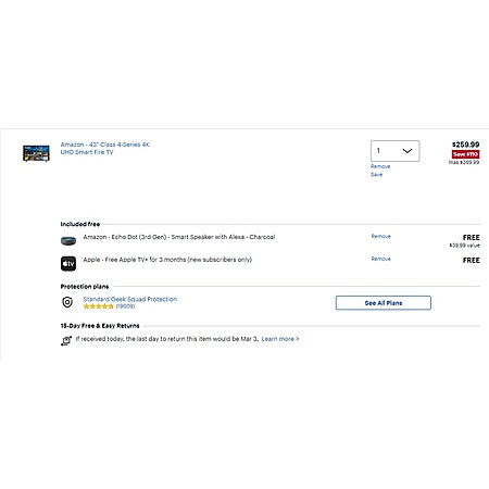 Amazon - 43" Class 4-Series 4K UHD Smart Fire TV + Free Amazon - Echo Dot (3rd Gen) $259 + taxes