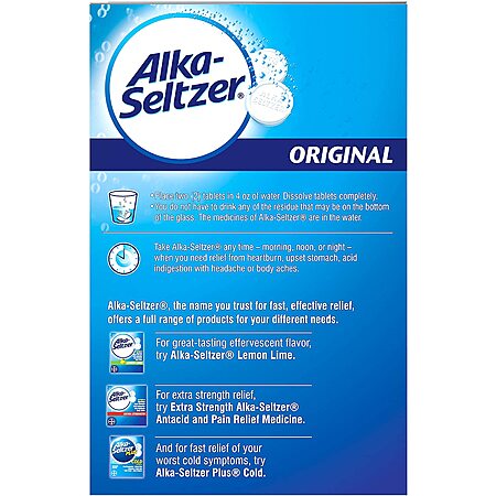 Amazon has 72-Count Alka-Seltzer Effervescent Tablets (Original) for $9.24 - 5% when you checkout via Subscribe & Save - 25% when you apply the coupon on product page = $6.47. Shipping is free w/ Prime or on $25+.