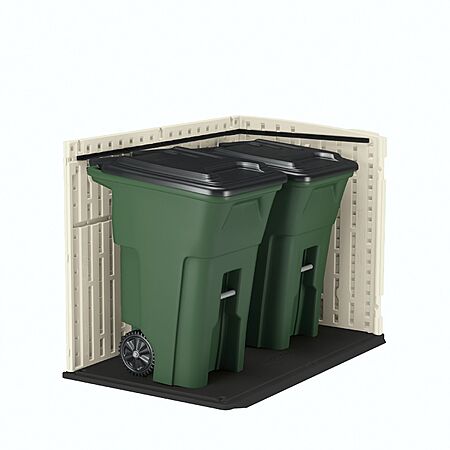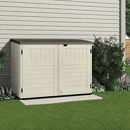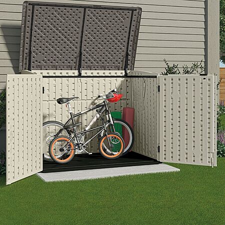 The Suncast 70-Cu.-Ft. Horizontal Shed features durable, double wall resin construction. A sturdy floor with ramp is extra reinforced for heavier items. This shed includes a lockable metal latch (lock not included) as well as gas shocks that make it easier to lift lid and keep it open. This shed is great for storing lawn and garden supplies, mowers, smaller bicycles and patio cushions, and fits two 96-gallon garbage containers.