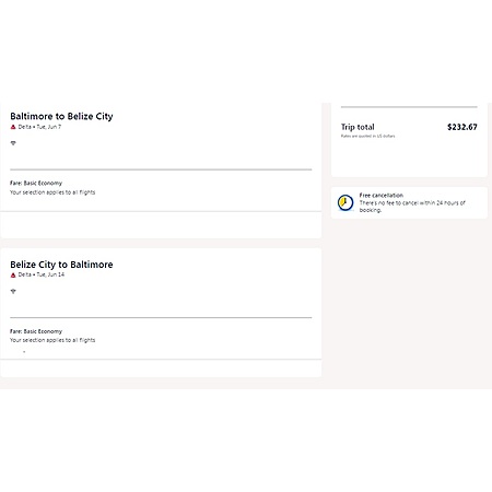 Delta Air Lines and Expedia have round trip airfares travelling from Baltimore (BWI) to Belize City (BZE) for $233, making 1 stop. These are basic economy fares, a restricted-type fare that allows a personal item and a carry-on bag. There is no seat selection and no changes.