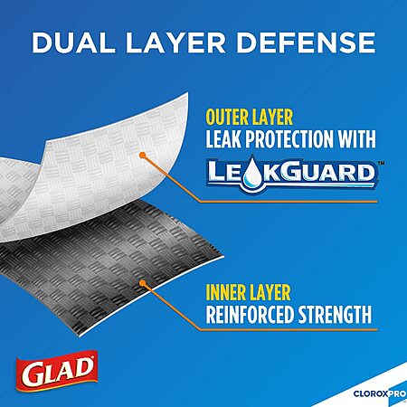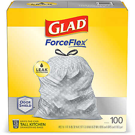• Our research indicates that this 100-Count CloroxPro Glad ForceFlex Tall Kitchen Drawstring Trash Bags (Gray) is $5.98 lower (33.2% savings) than the next best available price from a reputable merchant with prices starting from $17.98 at the time of this post.