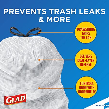 • These Tall Kitchen Drawstring Trash Bags from CloroxPro Glad trap, lock and neutralize odors to keep your rooms smelling fresh with OdorShield