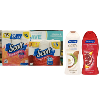 Walgreens offers 6-Pk Scott Paper Towels + 12-Pk Scott Toilet Paper + 2x 20-oz Softsoap Body Wash + $5 WG Cash for $11.78 when you follow the instructions below. Choose free store pick up where stock permits.