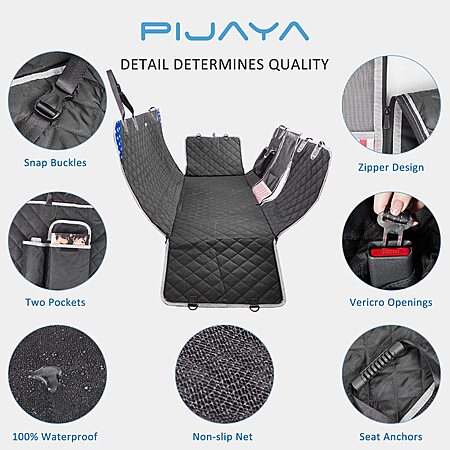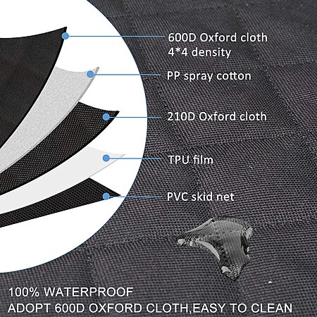 • Surface layer of premium 600D Oxford fabric and a middle layer of Oxford 210D with waterproof coating, the pet back seat cover remains waterproof, soil-resistant, and scratch-resistant