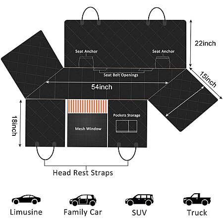 • Maximum open size (54" x 58"), the dog seat cover is specially designed to fit most automobile backseats