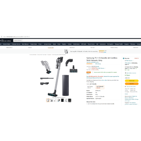 Amazon has Samsung Jet 75 Cordless Stick Vacuum and Clean Station Bundle (Grey) on sale for $205.78 after clipping the extra $325 Off coupon found on product page. Shipping is free.