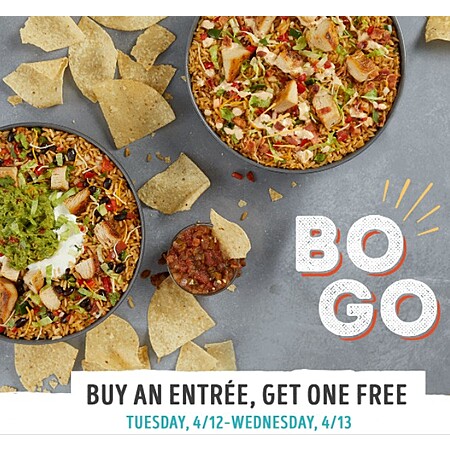 Offer valid for Moe Rewards Members for online, in-app or in-restaurant orders 4/12/22-4/13/22. Order must contain two adult entrées to redeem BOGO. Free item must be of equal or lesser value to qualify. One time use per promotional period per guest. One reward per purchase. Cannot be combined with any other offers, promotions, or discounts. Must apply reward at checkout. Taxes and $.35 service fee apply. Valid only for purchases at participating locations. Kid's entrées, kid's meals and meal kits are not included in the BOGO promotion. Additional restrictions may apply; void where prohibited.