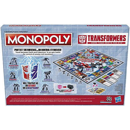 - In this exciting twist on the Monopoly game, players enter the world of Transformers and imagine traveling between Earth and Cybertron as a heroic Autobot or evil Decepticon. Choose to play as Optimus Prime, Bumblebee, Grimlock, Megatron, Starscream, or Soundwave in a race to take control of energy-rich locations. Buy, sell, or swap properties, build up a supply of Energon cubes, and construct Energon bunkers.