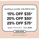 Save 25% on $75+ or save 20% on $50+ or save 15% on $35+ with code: Greatskin