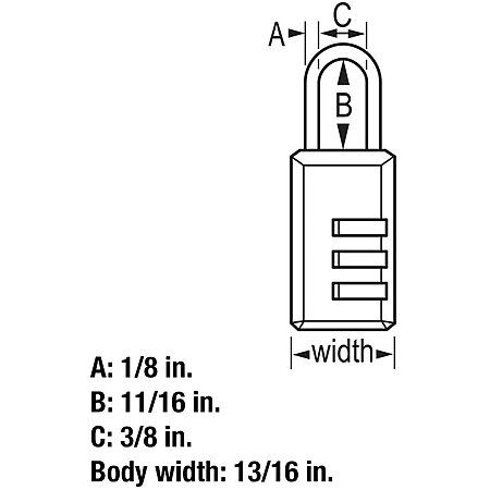 • 13/16 inch (21 millimeter) wide lock body; 1/8 inch (3 millimeter) diameter shackle with 11/16 inch (17 millimeter) length, 3/8 inch (10 millimeter) width