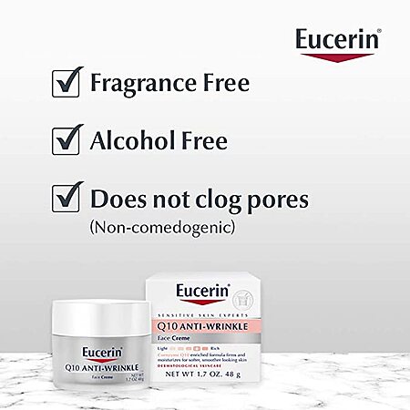 • Eucerin Q10 face cream for wrinkles is fragrance, alcohol and dye free, and can be used alone or under make-up