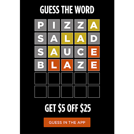 Blaze Pizza has a word puzzle to get $5 off $25. The answer is Flame