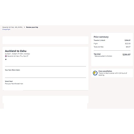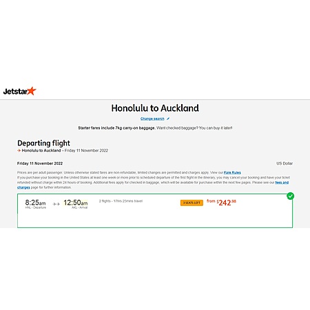 Jetstar, a low-cost air carrier headquartered in Australia, Hawaiian Airlines, Air New Zealand have round trip airfares travelling from Honolulu Hawaii (HNL) to Auckland NZ (AKL for $530. Jetstar's service is basic economy while returning flight is main cabin that includes seat selection, carry-on bag, checked-bag and free change (fare difference applies).
