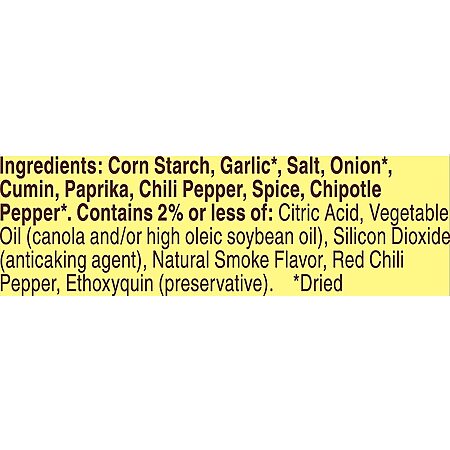 Ingredients: CORN STARCH, GARLIC*, SALT, ONION*, CUMIN, PAPRIKA, CHILI PEPPER, SPICE, CHIPOTLE PEPPER*. CONTAINS 2% OR LESS OF: CITRIC ACID, VEGETABLE OIL (CANOLA AND/OR HIGH OLEIC SOYBEAN OIL), SILICON DIOXIDE (ANTICAKING AGENT), NATURAL SMOKE FLAVOR, RED CHILI PEPPER, ETHOXYQUIN (PRESERVATIVE).*DRIED