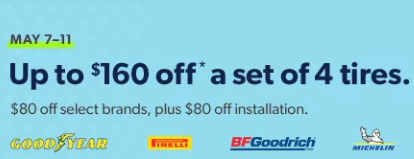 - $160 Off ($80 off tires & $80 off installation) a Set of 4 Goodyear Tires + Installation