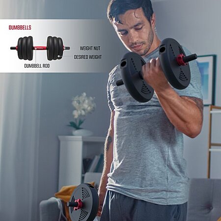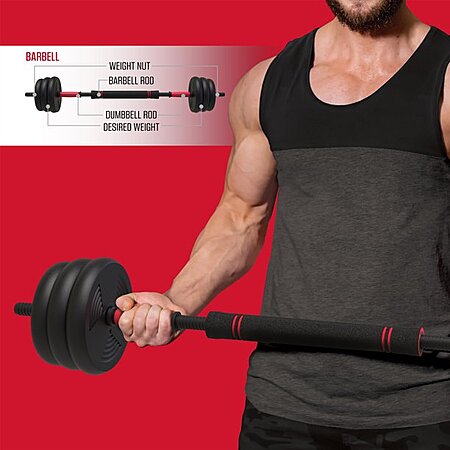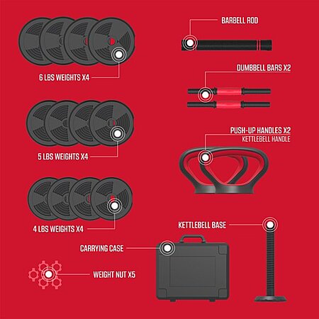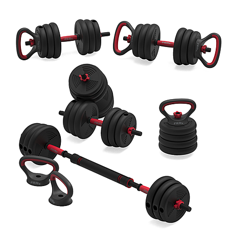 • 4-in-1 interchangeable weight system can be used as a barbell, kettlebell, two dumbbells, or push-up handles