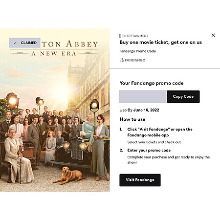 Xfinity is offering Select Xfinity Rewards Members: Tickets to Downtown Abbey - A New Era for Buy 1 Get 1 Free (up to $20 value) when you follow the instructions below.