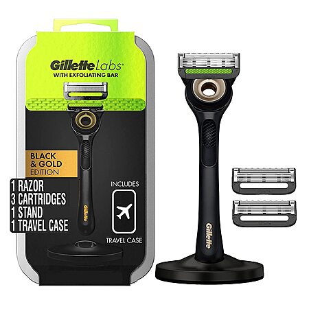 Model: Gillette Razor for Men with Exfoliating Bar Gold Edition by GilletteLabs, Includes 1 Handle, 3 Razor Blade Refills, 1 Travel Case, 1 Premium Magnetic Stand