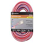 Model: Southwire Patriotic Indoor or Outdoor 50 ft. L Blue/Red/White Extension Cord 12/3 SJTW