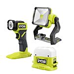 RYOBI introduces the 18V ONE+ Cordless 3-Tool Lighting Kit with Work Light, Compact Area Light, and LED Light (Tools Only). The ONE+ Work Light produces over 2400 Lumens to illuminate large work spaces and runs cooler than halogen or incandescent lights. With up to 7 days of runtime for the Compact Area Light, this is the perfect compliment for any extended use need. The three light settings and integrated dual lanyard loops allow for easy transportation. The Cordless LED Light is 75% brighter with 280 Lumens of light output. With up to 22 hours of runtime and over 500 feet of beam distance, you'll never be left the the dark. This ONE+ Cordless LED Light features a 130° pivoting head providing versatility and convenience. Best of all, it is part of the RYOBI ONE+ System of over 260 cordless tools that all work on the same battery platform. Backed by the RYOBI 3-Year Manufacturer's Warranty, this 18V ONE+ Cordless 3-Tool Lighting Kit includes an LED Work Light, a Compact LED Area Light, an LED Light, and an operator's manual. Battery and charger sold separately.