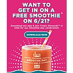 *Free 24 oz. smoothie with food purchase reward will be available in your Tropic Rewards account Tuesday, 6/21 once you join. Excludes breakfast, sides, and kids food items. To redeem reward, must scan app in-cafe at time of purchase, use app to order ahead for pick-up or delivery, or use Tropic Rewards™ account to order online via tropicalsmoothiecafe.com. Must redeem reward prior to expiration date listed in app. Reward will be applied to lowest priced 24 oz. smoothie ordered. Modifications, fresh add-ins, and supplements extra. Limit one free 24 oz. smoothie per order. Not valid with any other reward, offer, discount, or third-party services. One time use only. Valid only at participating locations.