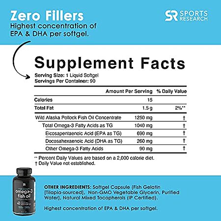 Sports Research Triple Strength Omega 3 Fish Oil Supplement - EPA & DHA Fatty Acids from Wild Alaskan Pollock 1250 mg Capsules (90 ct) $14.86