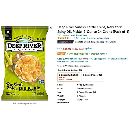 Amazon: Deep River Snacks Kettle Chips, New York Spicy Dill Pickle, 2-Ounce 24 Count, 20% Off AC (Select Accounts - YMMV), Free Prime Shipping $13.58