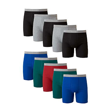 Hanes Men's Tagless cotton boxer briefs provide a soft and breathable feel. Our no ride up boxer brief keeps its shape and wicks away moisture to help keep you dry and comfortable. Available in a colorful assortment in a Super Value 10 pack.
