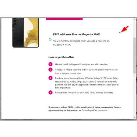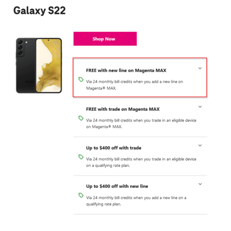 Contact us before cancelling service to continue remaining bill credits, or credits stop & balance on required finance agreement is due (e.g., $799.99 – Samsung Galaxy S22 5G 128GB). Tax on pre-credit price due at sale. Limited-time offer; subject to change. Qualifying credit, Magenta MAX service, & additional line required. If you have cancelled lines in past 90 days, you may need to reactivate them first. In stores & on customer service calls, $35 assisted or upgrade support charge may be required. Z Fold3 finance agreement & monthly bill credits are over 36 months for well-qualified customers. Up to $800 via bill credits; must be active and in good standing to receive credits; allow 2 bill cycles. Max 4 discounted devices/account. May not be combinable with some offers or discounts.