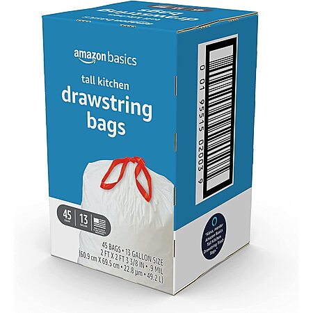 Amazon has 45-Count 13-Gallon Amazon Basics Tall Kitchen Drawstring Trash Bags for $5.08 - 5% off when you check out via Subscribe & Save = $4.83. Shipping is free w/ Prime or on orders $25+.