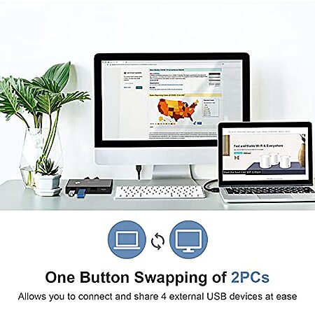 • Switcher for 2 PC Sharing 4 USB Devices, One-Button Swapping for Keyboard, Mouse, Scanner, Printer, Computer