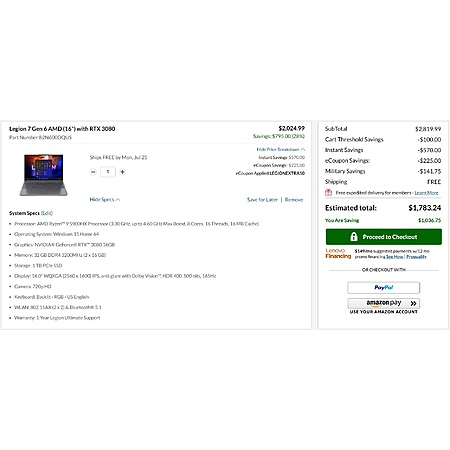 Lenovo.com offers qualifying ID.me members (Military / Teachers / Students / First Responders / Nurses) w/ Lenovo Rewards signup (free to join): Lenovo Legion 7 Gen 6 16" AMD Laptop (82N600DQUS) on sale for $1783.24 when you apply coupon codes LEGIONEXTRA10 and BTS2022 at checkout. Shipping is free.