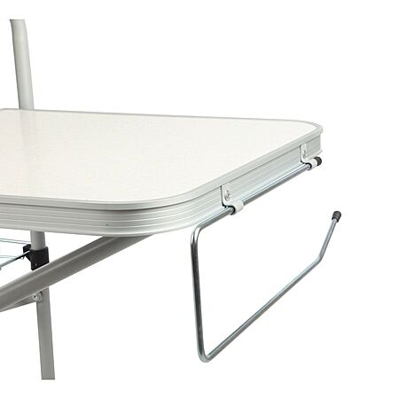 Durable steel frame with aluminum slat that sets up easily and provides a stable workspace