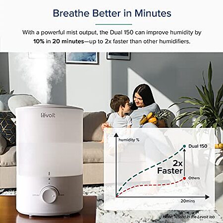 HUMIDIFY DRY AIR IN MINUTES: The Dual 150's 3-liter (0.79-gallon) tank can run for up to 25 hours, helping you combat congestion, coughing, and dry skin. Unlike other humidifiers that leak and rattle, this is the cool mist humidifier you keep.