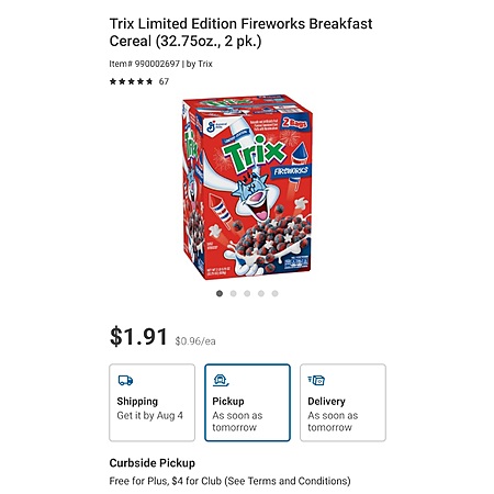 Sam's club Trix Fireworks cereal 2 bags $1.91 in club only ymmv